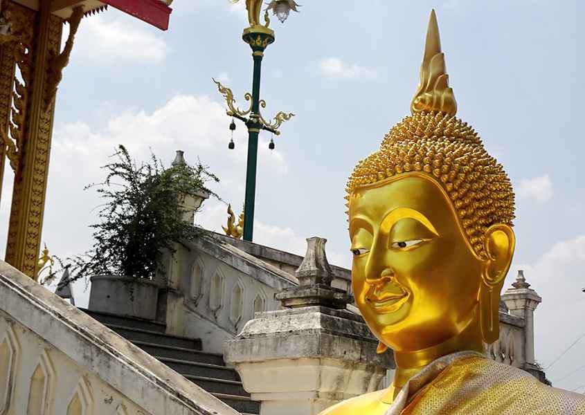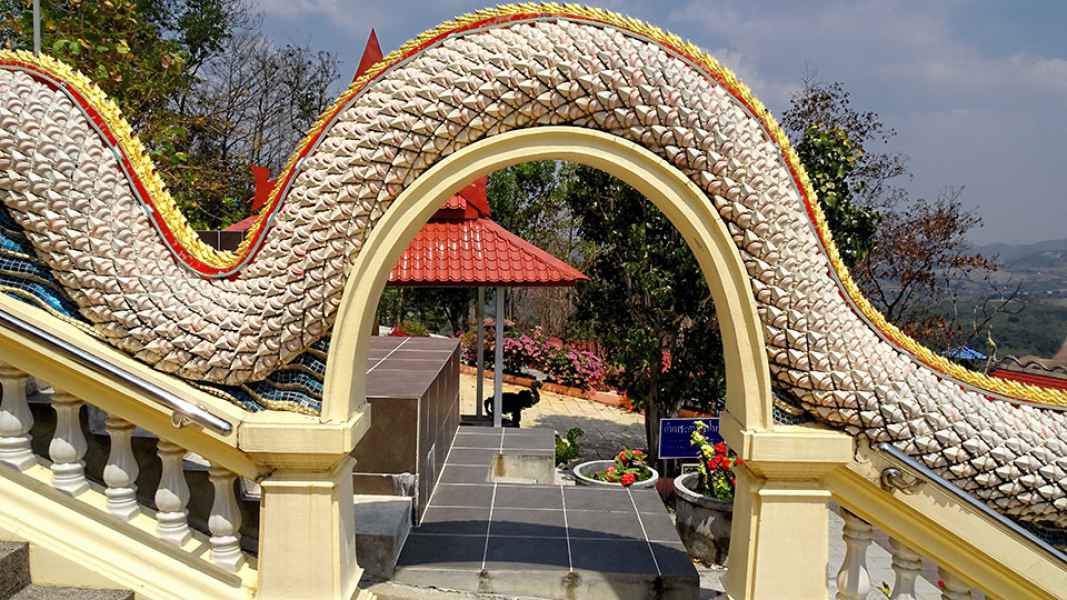 Zum Wat Pa Phu Hai Long im Khaoyai-Gebiet kommt man vor Ort mit dem Auto über eine steile Einbahnstraße, muss aber doch noch einige Treppenstufen hochsteigen. Man wird belohnt durch eine ansprechende Tempelanlage und eine schöne Aussicht.