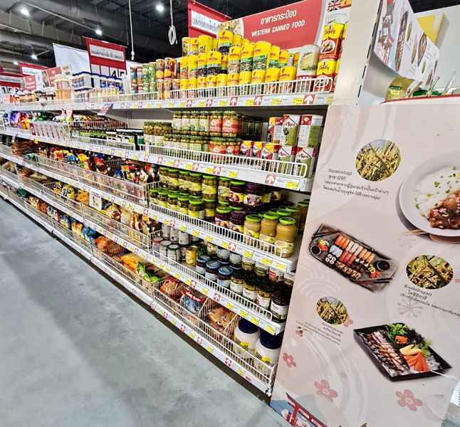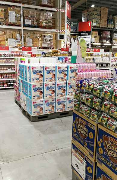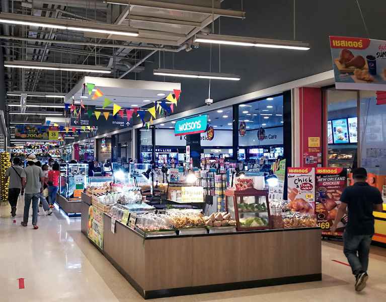 Der Platzhirsch ist Lotus. Dieses Einkaufszentrum gibt es hier schon seit vielen Jahren, wurde vor wenigen Jahren noch vergrößert und hat kürzlich den Besitzer gewechselt – vom britischen TESCO zum thailändischen CP (dem gehört u.a. auch 7/11 und TRUE). Zur Zeit findet ein komplettes Umbranding von Logo und Grundfarbe (Türkis) statt - bisher aber nur auf der Kochsalztüte zu sehen.