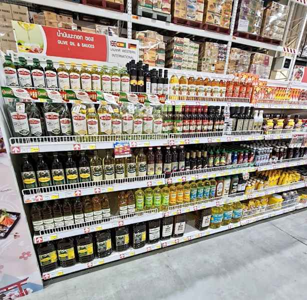 So gibt es ein doppelseitiges „Ausländerregal“ mit Waren – meist Konserven – aus verschiedenen Regionen. An einem Ende des Regals findet man deutsche Waren als Konserven: Gewürzgurken, Rotkohl, Rote Beete, Kapern, Sauerkraut, Apfelmus u.a. Auf der Rückseite gibt es eine Auswahl an Essigsorten und Ölen und in der englischen Abteilung Saucen-Tüten, Kartoffelbrei. Auch ein reichhaltiges Angebot an Nudeln findet man.