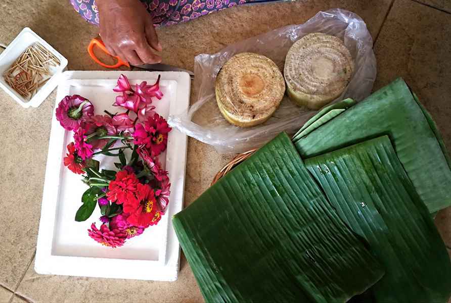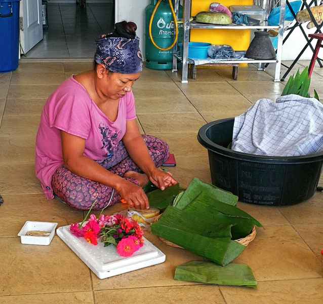 Die Kratongs kann man entweder selber basteln (als Grundlage bitte nicht Styropor sondern eine Bananenstamm-Scheibe) oder vor Ort kaufen.